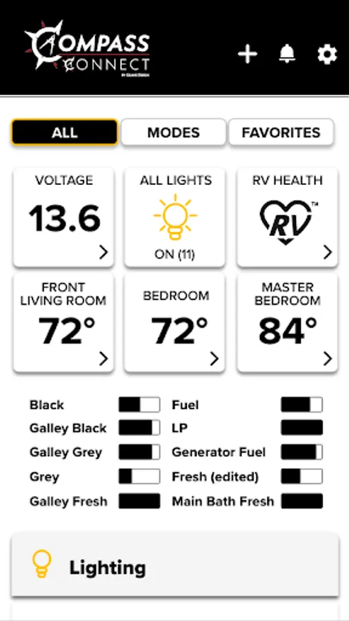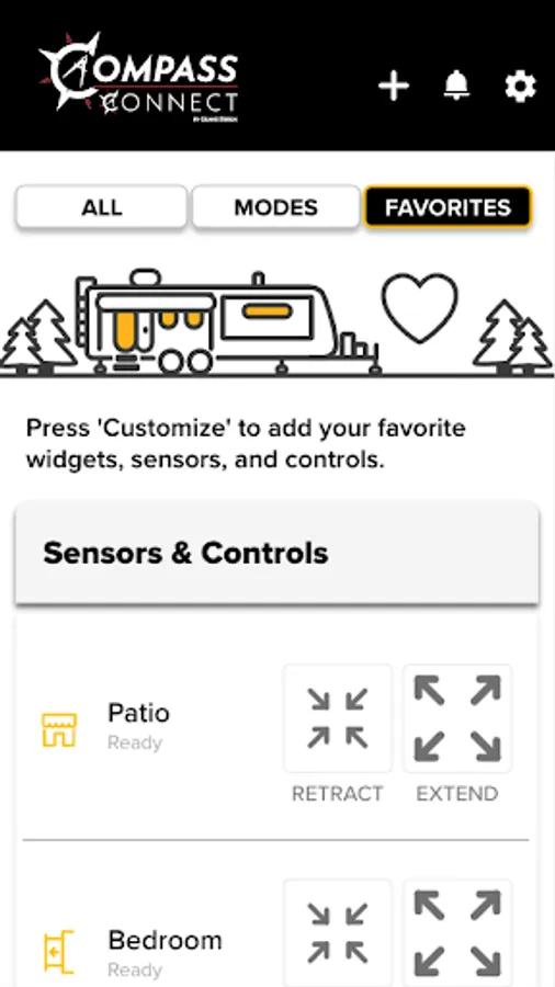 Compass Connect® makes it easy to remotely control and monitor your RV’s Wi-Fi and Bluetooth®- enabled devices. Use the Compass Connect app on your phone or tablet to operate leveling systems, lights, slide-outs, awnings and more when in Wi-Fi or Bluetooth range of your RV. You can check water tank levels, battery status and temperature too. Use the new Modes feature to customize devices for each part of your trip and in the order you like.