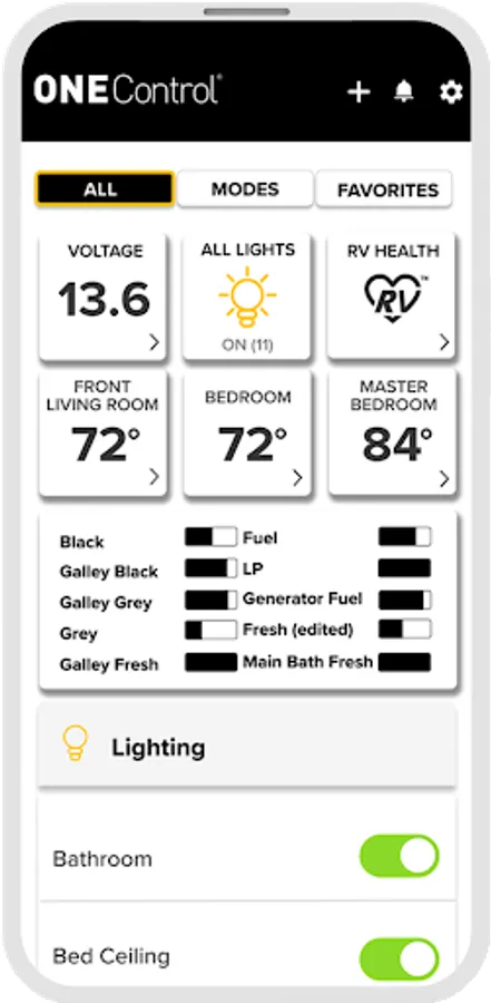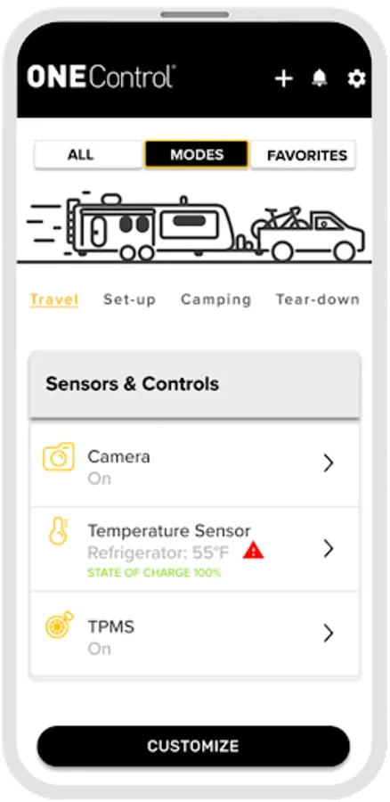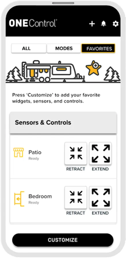 OneControl® makes it easy to remotely control and monitor your RV’s Wi-Fi and Bluetooth®- enabled devices from Lippert™. Use the OneControl app on your phone or tablet to operate leveling systems, lights, slide-outs, awnings and more when in Wi-Fi or Bluetooth range of your RV. You can also check water tank levels, battery status and temperature. Use the new Modes feature to customize devices for each part of your trip and in the order you like.