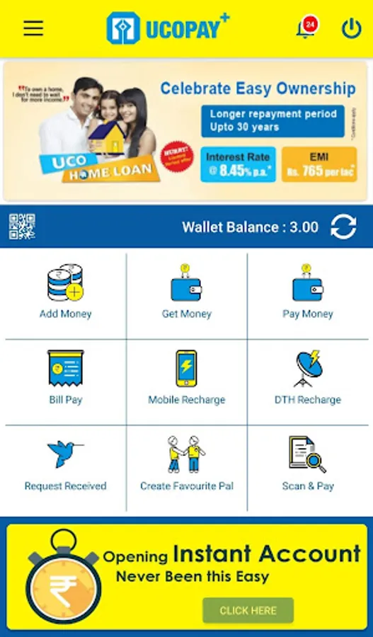 UCOPAY+ is a semi closed digital wallet application on Android platform to cater your financial requirement. It is electronic virtual wallet where you can load money and spend it for your Mobile recharge/ DTH recharge/various utility Bill Payments including Gas, Electricity, Insurance, Mutual Funds, etc., sending money to your near & dear ones. It contains various features like adding money from your net banking/debit card/credit card, getting money from your pals, paying money to your pal’s wallet/UCO Bank account. It provides facility of QR Code scanning of merchants and doing quick payment.