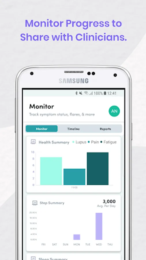 Monthly, the AutoimmuneCorner Report will be shared with your rheumatologist. It includes your health goals, key tracking features, and relevant health data