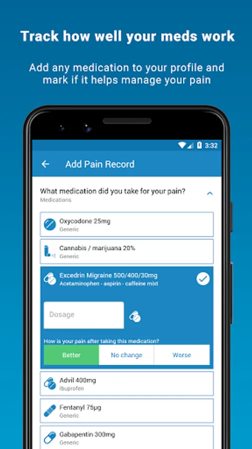 • Track how well your meds are working: Add any medication to your profile and mark if it helps manage your pain