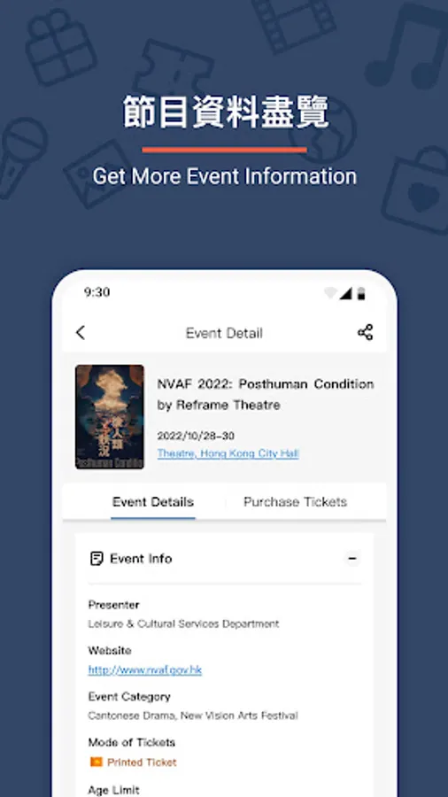 “URBTIX” is a brand new mobile app to facilitate ticket buyers to make purchases online using smart phones more conveniently. For ticket buyers who have registered as members, this app will further provide a wide range of personalised functions to enhance their buying experience including bookmark on favourite events, email reminder to attend purchased events, keeping and transfer of e-tickets, use of biometric authentication features such as fingerprint / face ID for member log-in, etc.