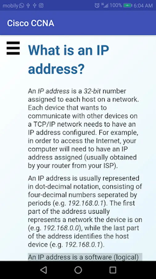 We made this application for the help of the new students or professionals who are interested for networking field and want to prepare the Cisco CCNA Exam. Note that Cisco Systems, Inc. is in no way affiliated with the application.