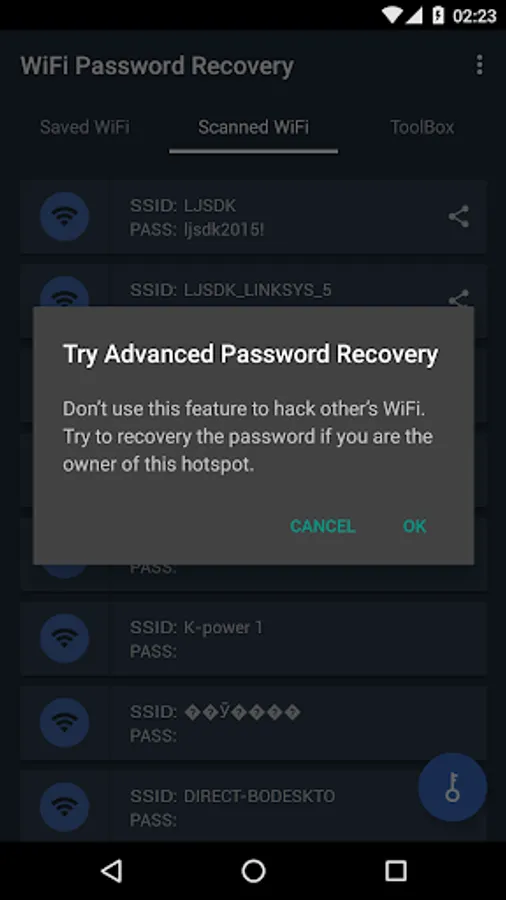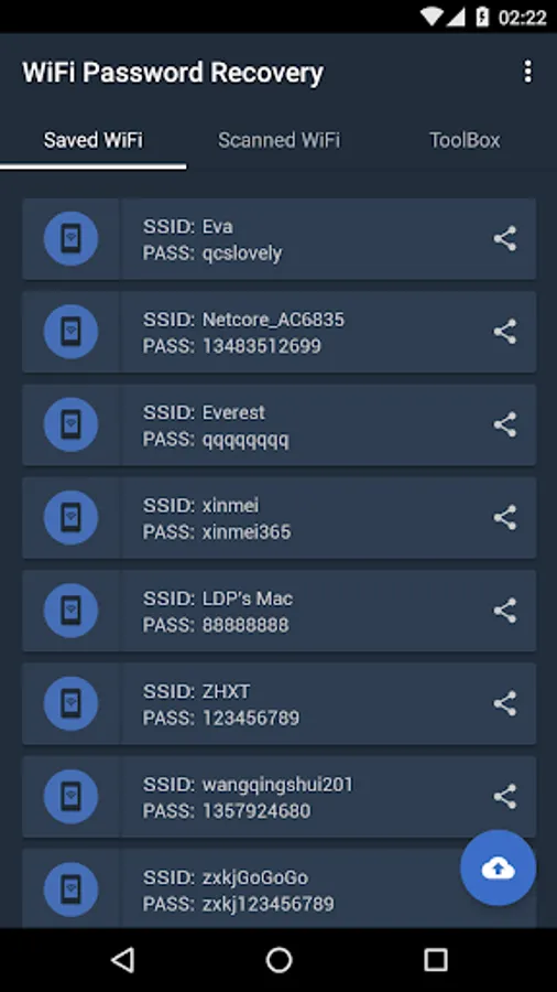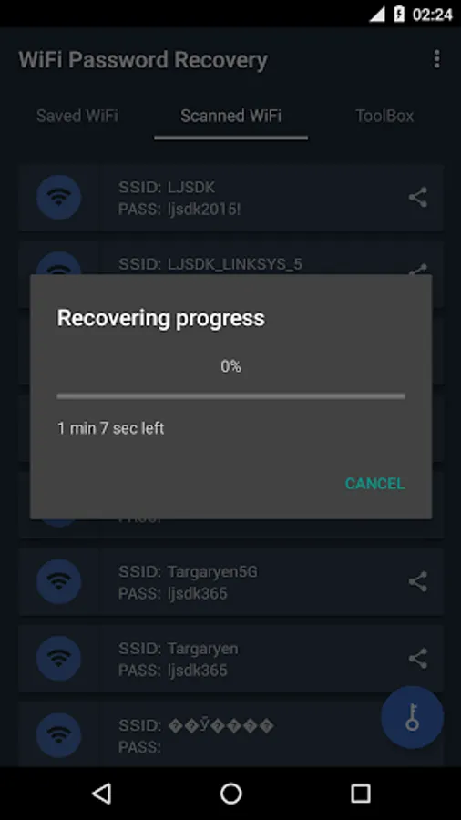 WIFI Password Recovery is an application to view all your saved/scanned WiFi passwords on your android devices.Remeber it’s only restore connected wifi passwords.WIFI Password Recovery is a simple and powerful tool to view wlan passwords on your android devices.Recovery wifi passwords won`t work without root.
