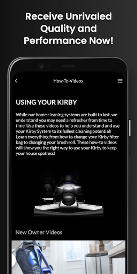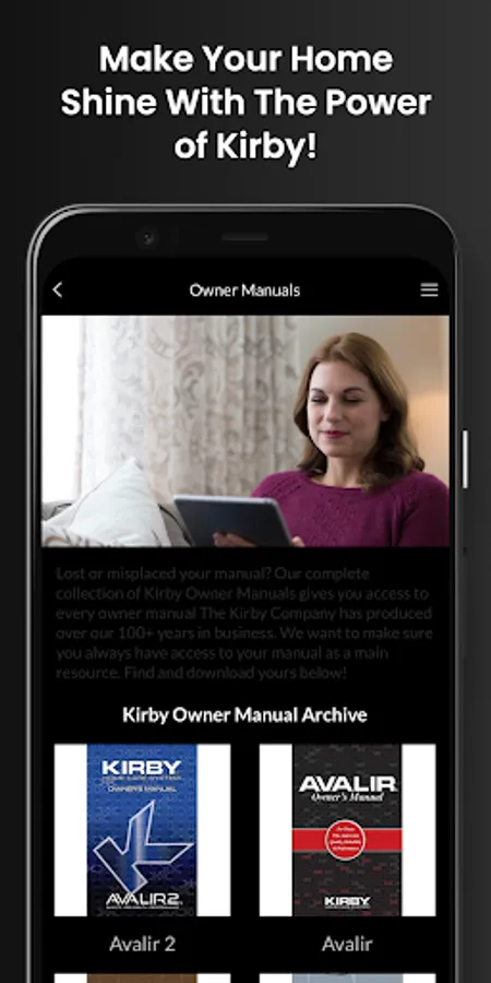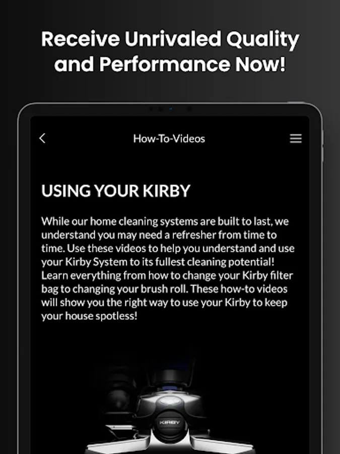 The Kirby Owner Resources App is here to provide Kirby Owner’s with product support, easy online shopping, and every Kirby owner manual right on your smartphone or tablet! This app is made for your convenience to easily connect you with how-to videos, frequent asked questions, and more, right in the palm of your hand. The Kirby Company strives to provide customers with the best cleaning experiences due to the system’s versatility, performance and long-lasting quality. This app is designed to assist all Kirby Owners and make sure they get the most out of their Kirby Home Cleaning System.