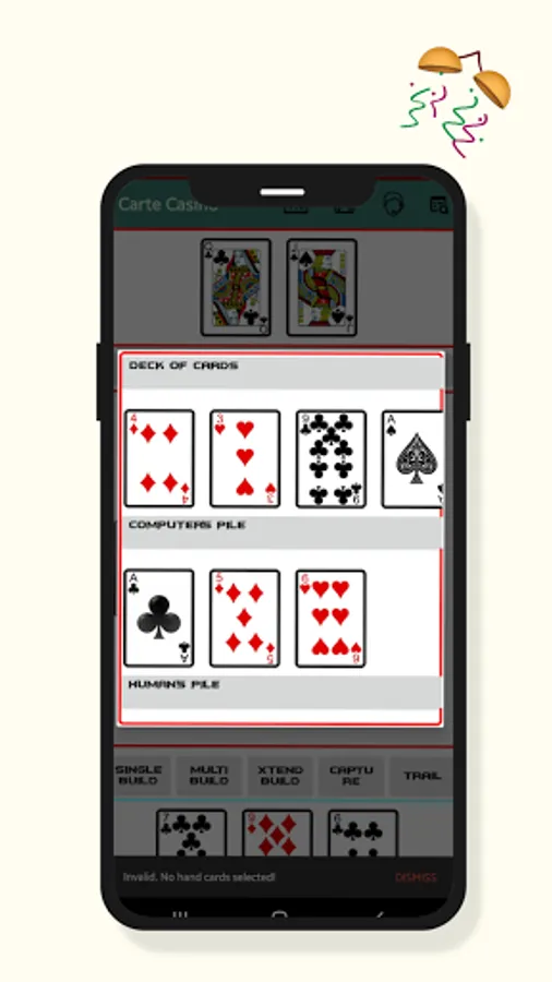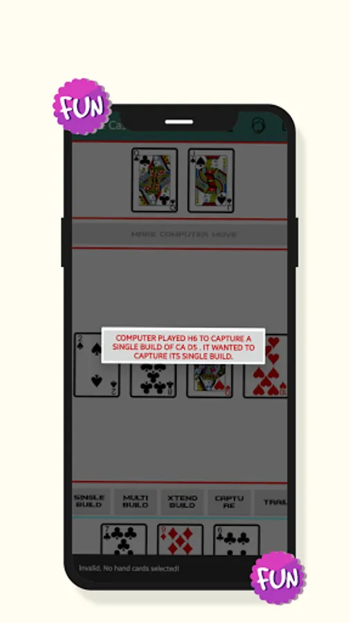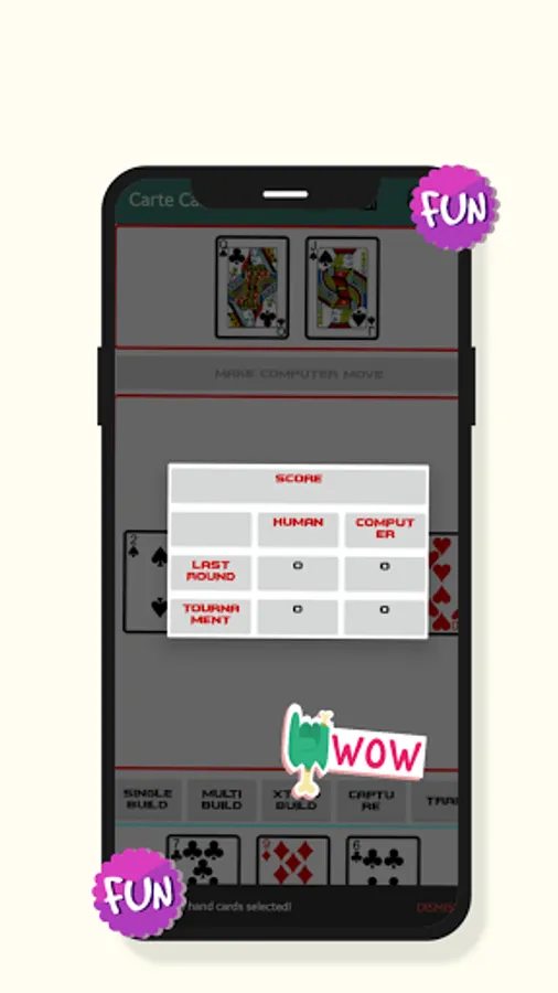 Two players play this game - one player will be the human user, and the other player will be computer. The two players will play a "tournament", consisting of one or more rounds. Each round will consist of the two players playing till all the cards have been captured. The tournament ends when one of the players scores 21 or more points.