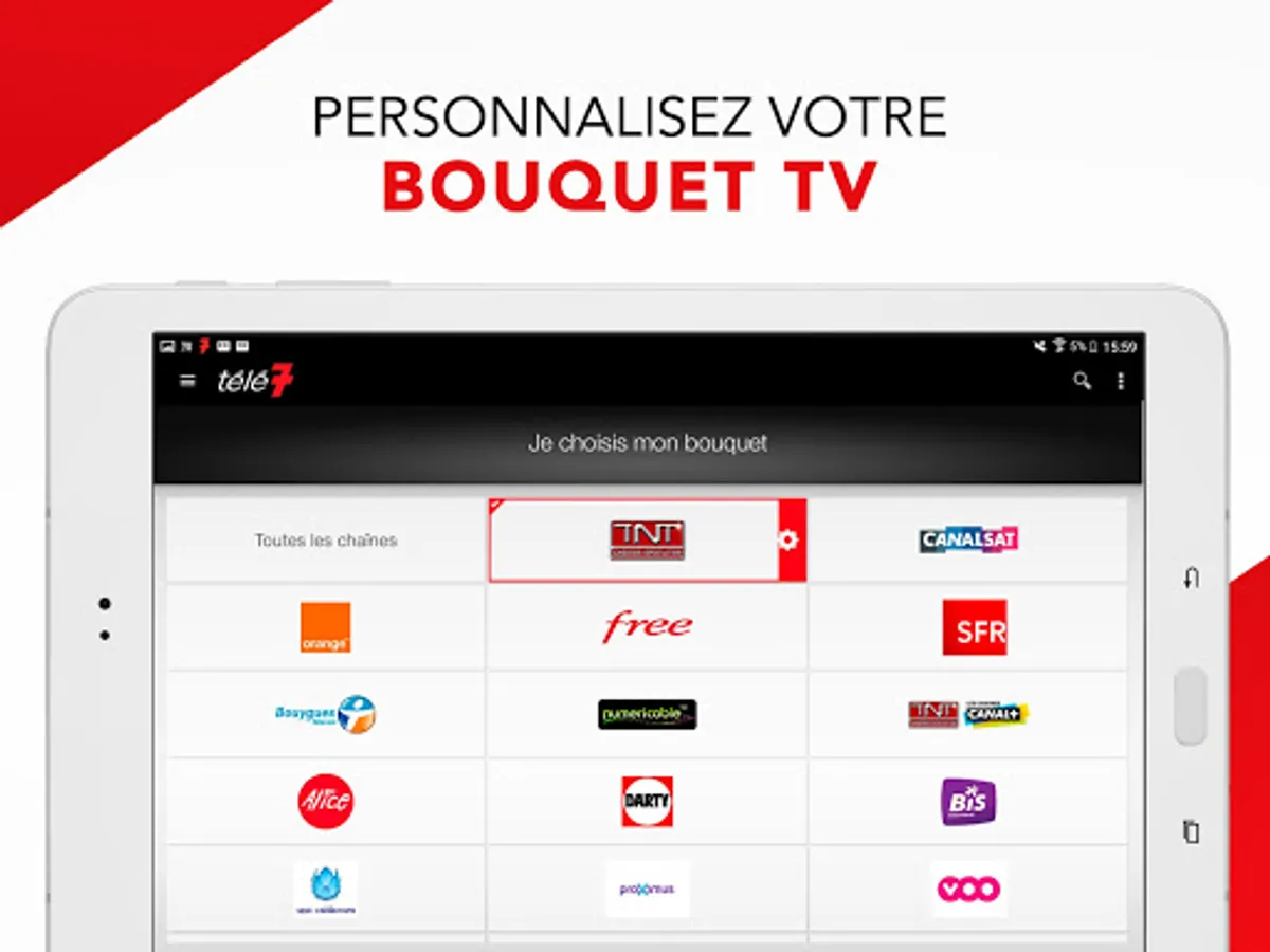 - Create your personalized TV guide by choosing the bouquet and channels you receive. You can freely add your favorite channels and choose the order in which to display them: TF1, W9, TV France, M6, BFMTV, Gulli ... your choice! If you do not want to configure it you will have the default tnt tv program.