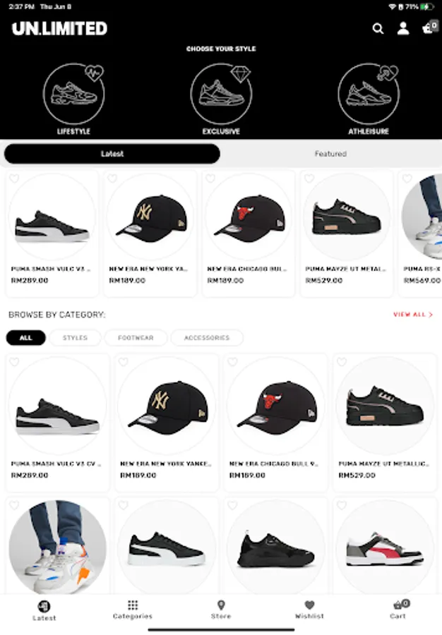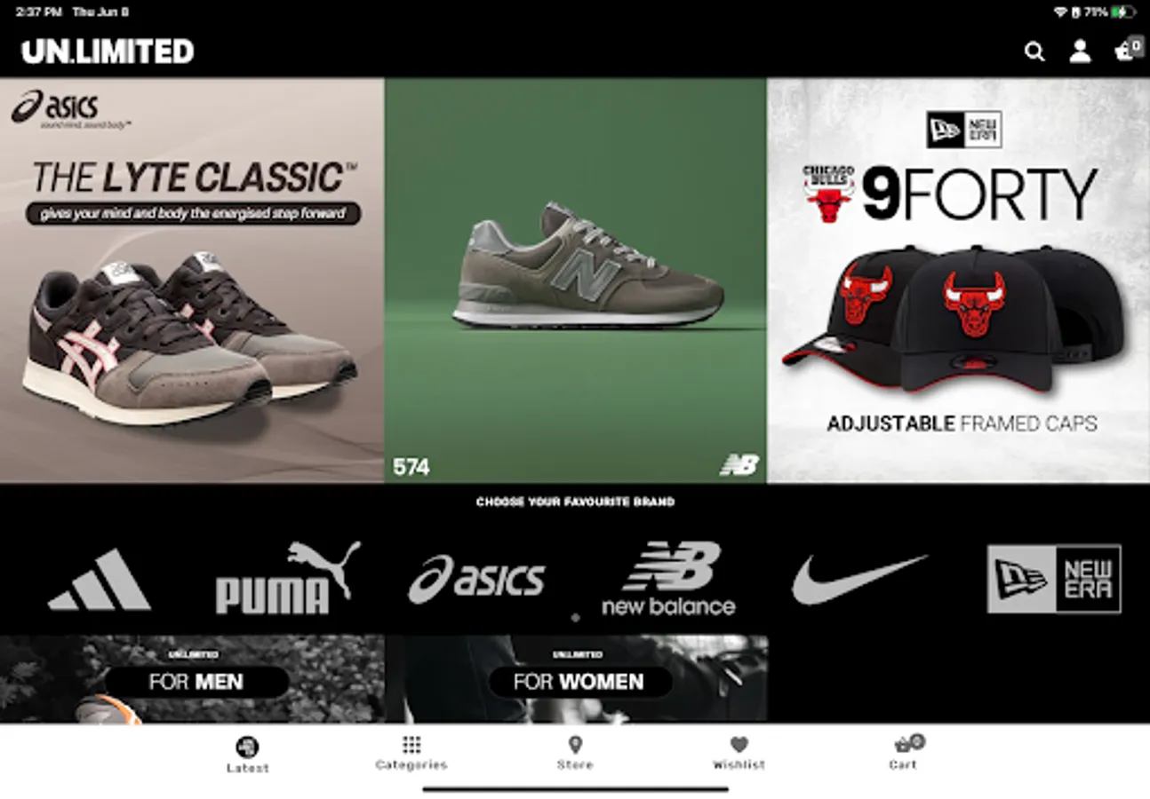 Download the UN.LIMITED app now and choose from a wide selection of athletics, sandals, slip-on loafers, sneakers, and accessories from renowned international prestige brands like Adidas Original, Puma Sport style Prime, ASICS, Nike NSW, New Balance, and New Era.