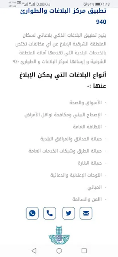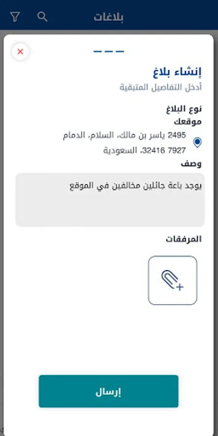 يتيح نظام البلاغات الذكي "بلاغاتي" لسكان المنطقة الشرقية الإبلاغ عن أي مخالفات تختص بالخدمات البلدية التي تقدمها أمانة المنطقة الشرقية و إرسالها لمركز البلاغات و الطوارئ ٩٤٠ .