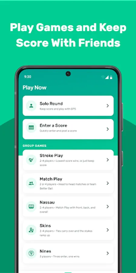 - On-course games, including Match Play, Nassau, Skins, Nines and Stroke Play