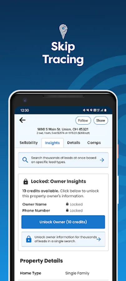 - Industry-leading Skip Tracing technology uncovers owner information with a single click.