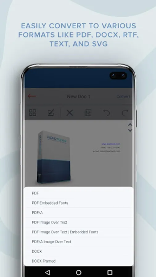 • Convert documents into many different formats including; PDF, PDF/A, DOCX, SVG, RTF, and more