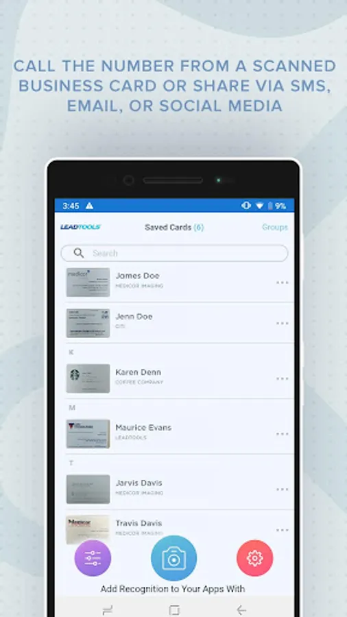 The LEADTOOLS Business Card Scanner application performs automatic Optical Character Recognition (OCR) and barcode recognition on images to read any business card and extract its information at high speed and accuracy. Users are able to easily manage, exchange, search, and access an unlimited number of business cards. The scanned business cards can be saved to a virtual card holder that allows you to quickly grab, share, add to contacts, export to databases, and store the information easily on your phone.