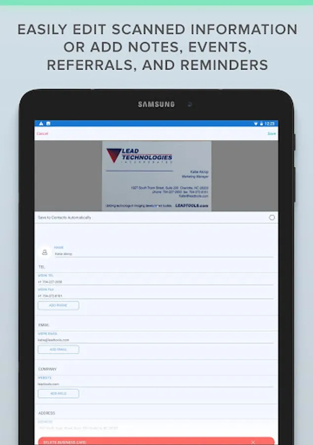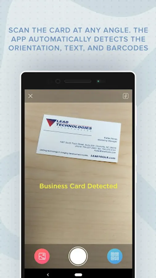 - Automatically focuses on the business card, captures the picture, detects the card edges, and crops any unnecessary background