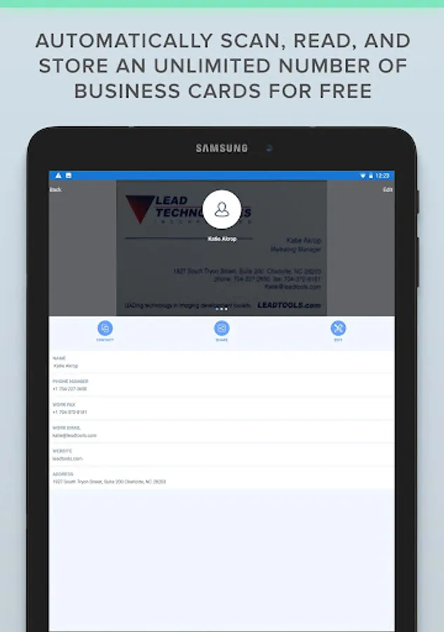 - Automatically scan, read, and store an UNLIMITED number of business cards for FREE