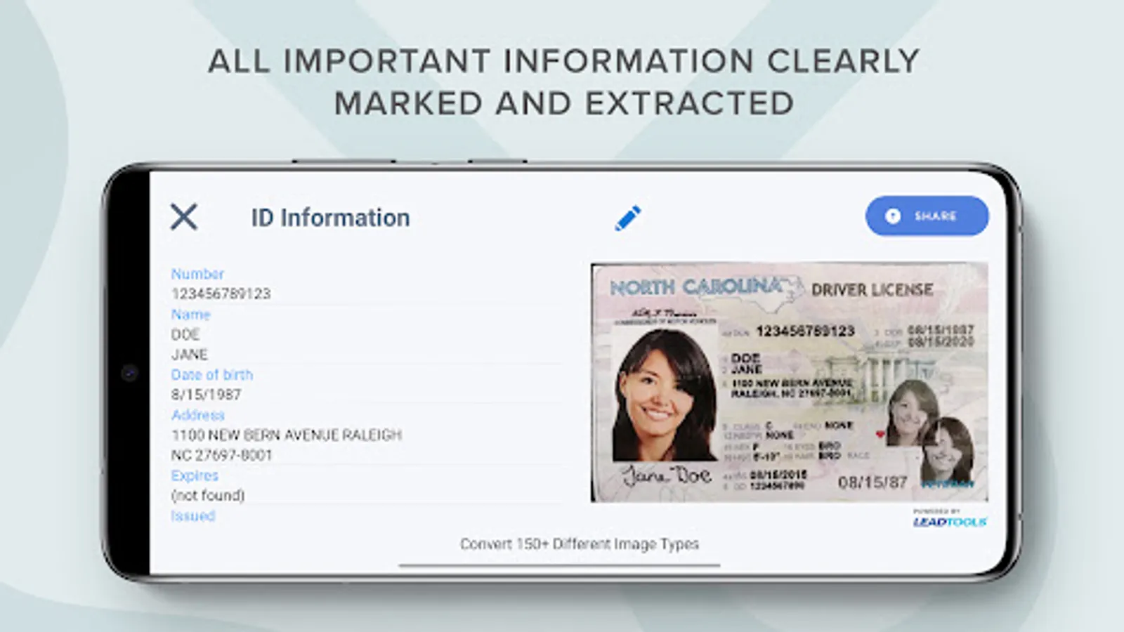The LEADTOOLS ID Reader App for iPhone, iPad, and Android demonstrates the phenomenal power of the LEADTOOLS Forms Recognition Software Development Kit (SDK). Using only the CPU of a mobile device, the LEADTOOLS Forms SDK can extract data from live video and still-images, while dealing with real-world issues such as glare, movement of the camera and identification, and reflections on lamination. Remarkably, only taking fractions of a second, the ID Reader App can process, recognize, and extract data in real-time from physical driver’s licenses, work authorizations, and identification cards with only a smart phone.
