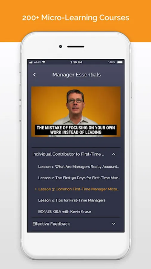 • 200+ micro-learning courses on topics that include: giving effective feedback, delegation, one-on-one meetings, employee engagement, authentic leadership, executive presence, grit & growth, managing change, manage your inbox, cure procrastination, maximize your focus, business writing, active listening, personal branding, business etiquette.