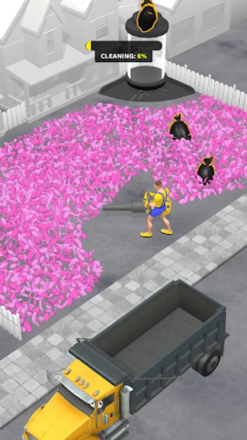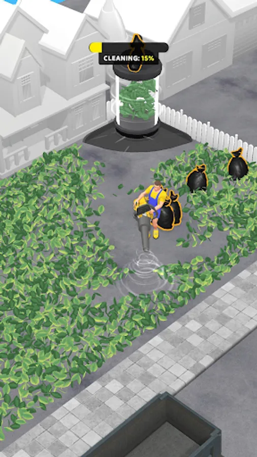 The core of this idle game is plain. Pick a lawn, take your leaf blower, and clean it all! Collect garbage bags and load them in your truck to earn some money. Spend it to improve either your character or your leaf blower to clean up even faster.