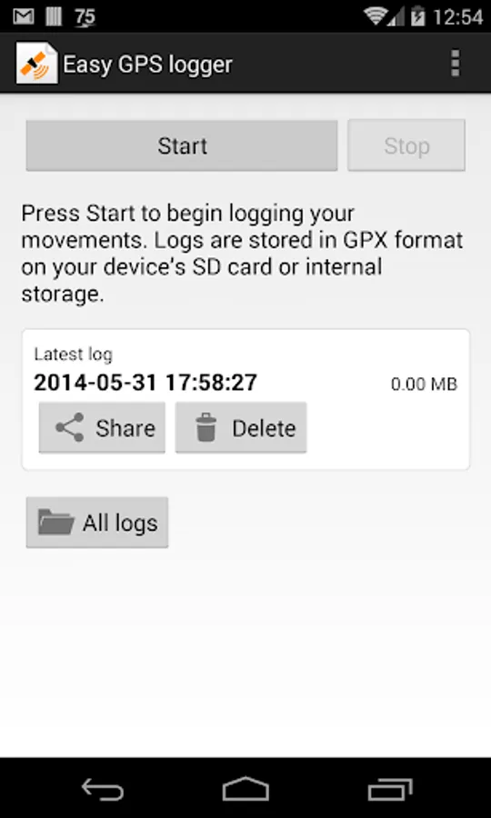 This app turns on GPS and records your location (once per second) to a log file in standard GPX format.