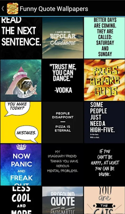 The wallpapers in this app are full of funny or witty quotes that will have you smiling every time you see them. Whether you're the type who likes subtle sarcasm or in-your-face comedy, you'll be sure to find plenty of wallpapers that will make you laugh! The backgrounds in this app feature cute and clever sayings and quotes that are funny and unique, like you! They poke fun at popular culture, put a spin on motivational quotes and highlight strange personality quirks – all in the name of humor.