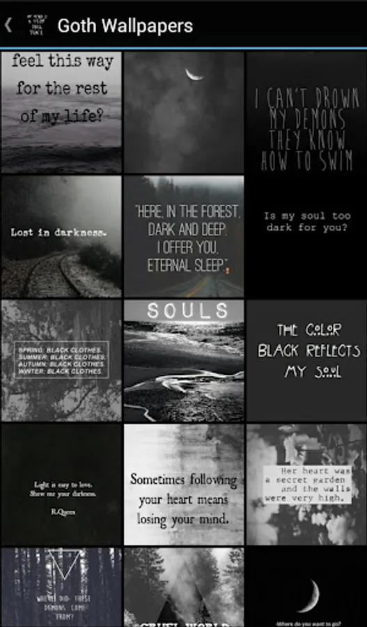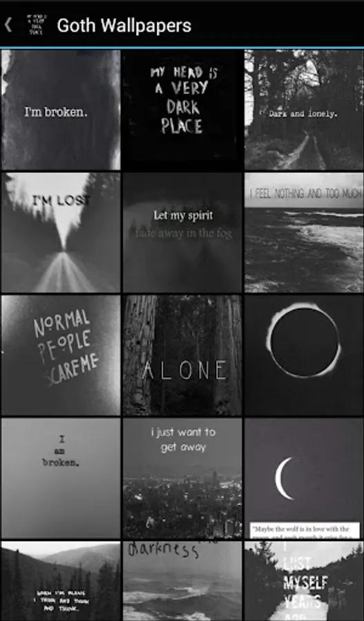 With influences from classic Gothic literature, horror stories and gothic rock music, modern goth culture represents isolation, pain, loneliness, darkness and deviance. While goth music and dark fashion are icons of goth culture, it is the underlying thoughts and emotions that really matter; feelings of pain, angst and darkness ravage your brain. The wallpapers in this app reflect these things, showing lonely, dark images, paired with quotes and phrases and highlight the isolation and sadness you feel.