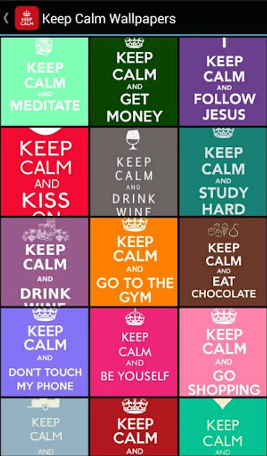 Originally a British motivational poster, the Keep Calm theme became such a widespread inspiration in modern day mainstream culture that it has spawned countless spin offs and counter-movements. Whether you're looking for a serious motivational background or a funny spoof, this is the app for you! Some wallpapers feature inspirational Keep Calm sayings to keep you focused or help you stay strong in the face of challenges, while others feature humorous spinoff phrases such as "keep calm and eat chocolate" or "keep calm and be a princess". No matter what your hobby, silly or serious, you'll find the perfect Keep Calm wallpaper to show off your style! From music to food to exercise to Jesus, these Keep Calm backgrounds run the gamut!