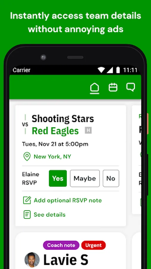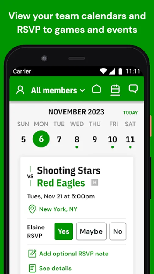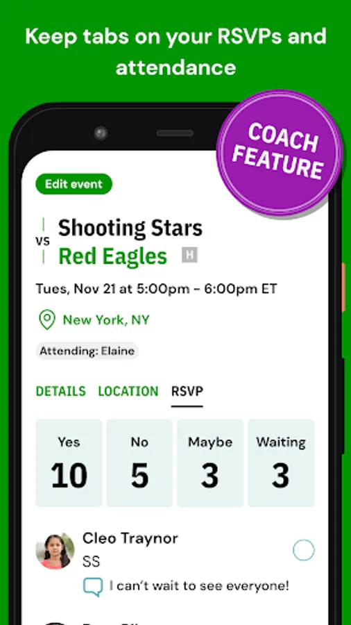 - RSVP for games, tournaments, practices, and more, and view locations and directions