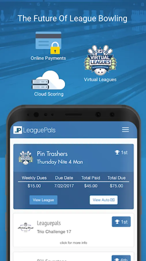 LeaguePals is designed for bowlers and centers to modernize your league experience. For the first time, pay league dues online, join virtual and bowling leagues near you, interact with the industry’s first cloud scoring, and streamline all league tasks with our cloud league management platform.