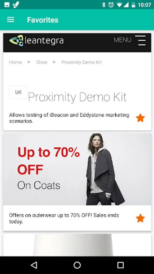 In addition, Leantegra Pilot app incorporates a comprehensive list of Proximity Marketing features. One can configure ad content for Push Notifications which will be sent to clients once they are in near location to a point of interest, or messages for ‘Offers’ list which will be visible for all venue visitors. Once an offer expires, it will be automatically moved to the ‘Expired’ list.