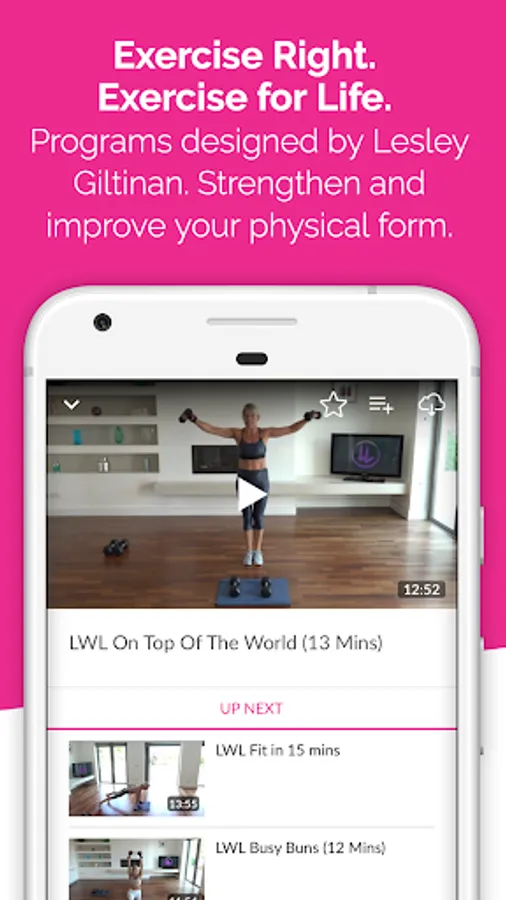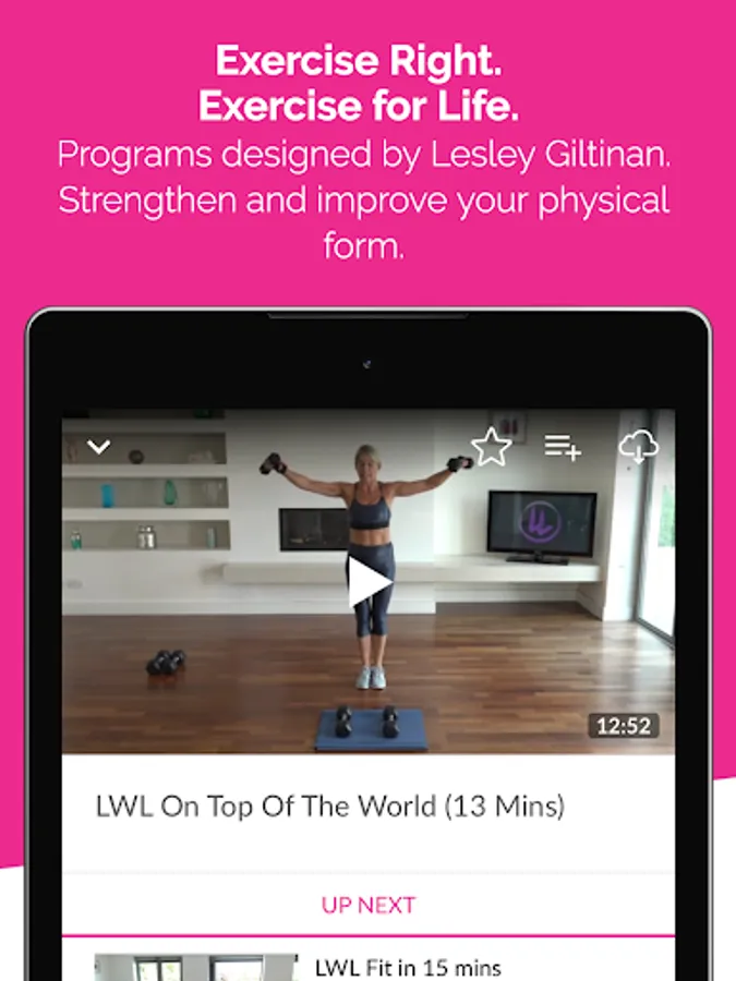 LWL is a full library of motivating workouts from fat burn to strength with plenty of cardio too. High quality programs designed by Lesley including mini sessions for busy schedules that can be done anywhere at any time. These are genuine workouts for all levels of fitness. There are no frills and fake promises, simply do the workouts with Lesley at your own pace in your own time and you are guaranteed to feel healthy, strong and fit and that’s a promise.