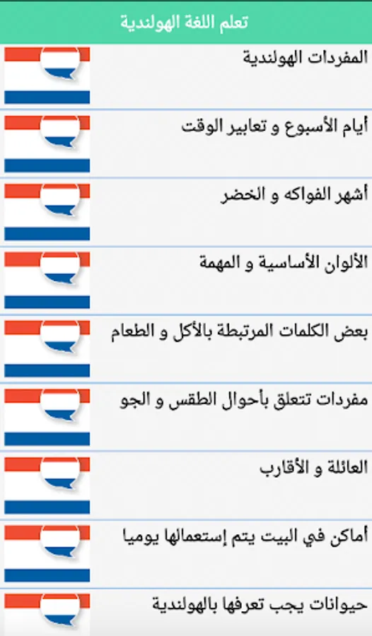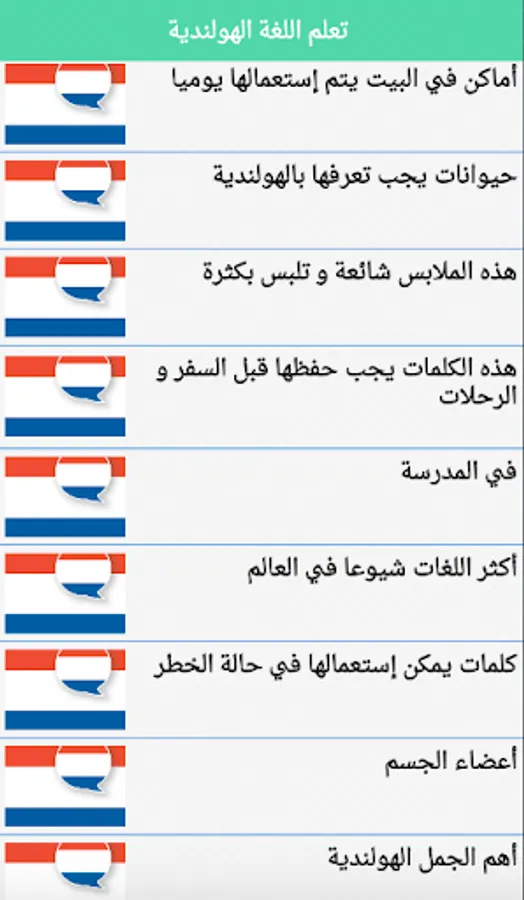 The Dutch language learning application is a comprehensive application that contains several sections and several different conversations according to each case, all this to facilitate learning and without the Internet. This application also contains simple, easy and new ways to facilitate communication in addition to words.