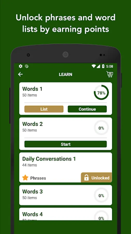 - Earn points by learning and practicing. Then unlock phrases and word lists.
