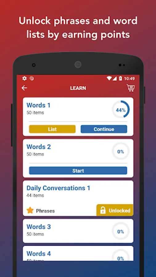 - Earn points by learning and practicing. Then unlock phrases and word lists.