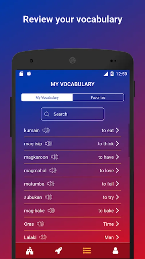 Learn 3500 Filipino nouns, adjectives and verbs to enrich your vocabulary. Memorize most common Filipino words. Listen pronunciation of the words. Learn with word games, phrases and word lists. Use flash cards to master frequently used, core vocabulary.
