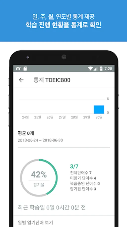 ● 일, 주, 년, 월 별 학습된 단어의 수를 기간별로 통계, 그래프로 제공