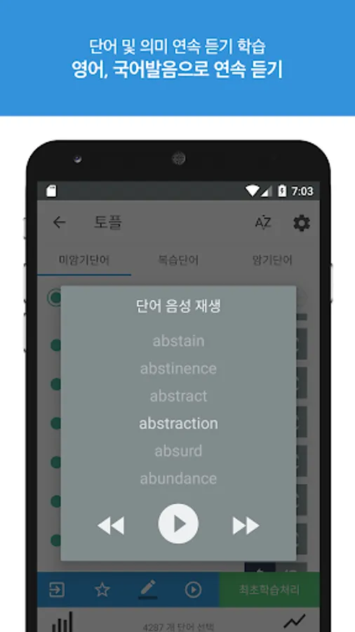 ● 선택된 단어 또는 단어와 뜻을 연속 듣기로 학습 가능