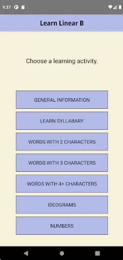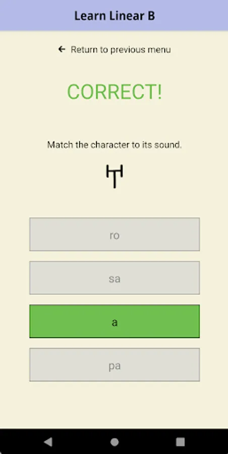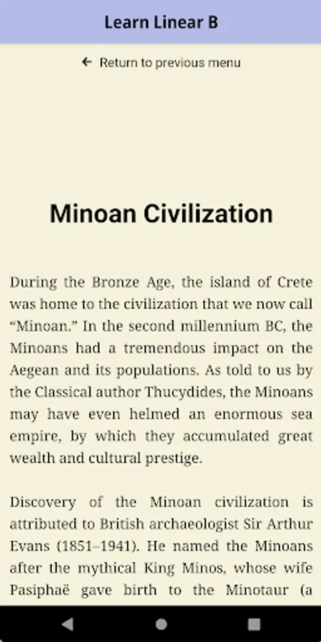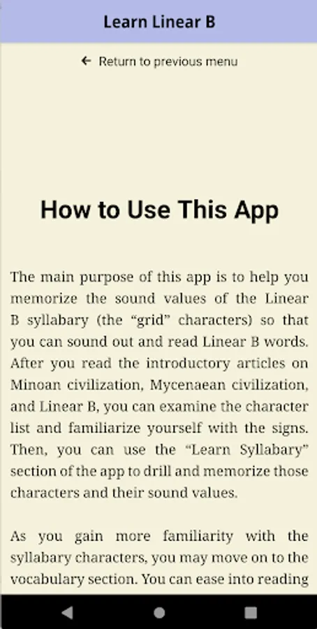 The purpose of this app is to help you learn Linear B, the ancient script of the Mycenaean Greeks. The Linear B script appeared on Crete around 1450 BC. Apparently, the Mycenaean Greeks borrowed the characters of the Minoans’ Linear A writing system and adapted these characters into a new system for writing down their language, which is the earliest known form of the Greek language. This app contains quiz-style drills that allow you to learn the individual Linear B characters and then move on to sounding out and translating Linear B words.