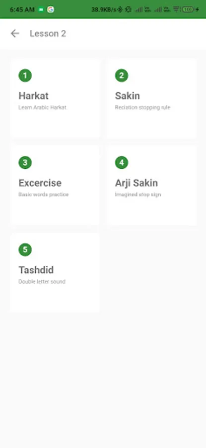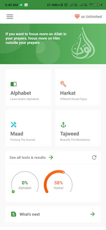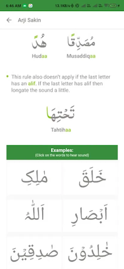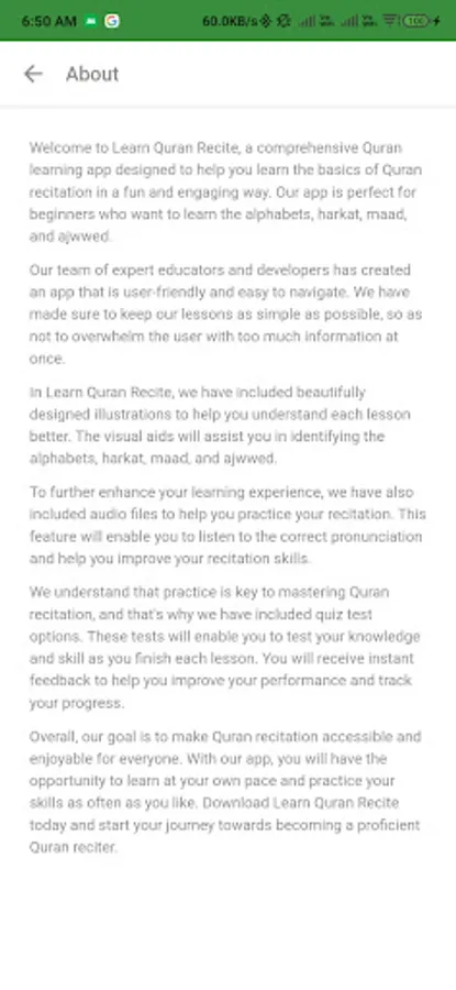 With our free app, you can learn Quranic recitation, alphabets, harkat, maad, tajweed, sings, tashdid, sakin, and more, along with high-quality audio recordings of Quranic verses. You can also test your knowledge with our quiz feature, which includes scores and lessons to help you track your progress.