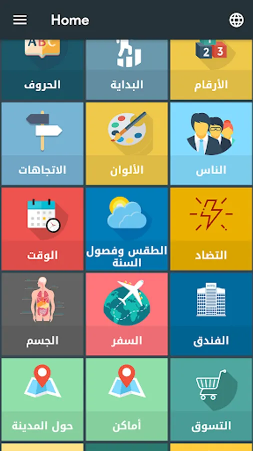 It has several sections: letters, your start, numbers, directions, colors, people, time, weather, seasons, contrast, body, travel, hotel, around the city, places, shopping, restaurant, food, beach, hobbies, Health, in the office, work, computer. It's great for you and your kids to learn English perfectly.