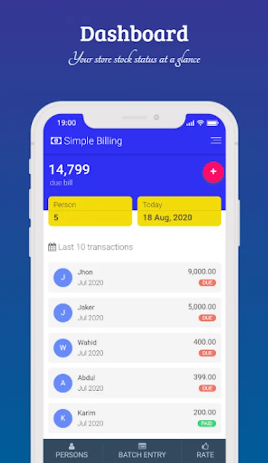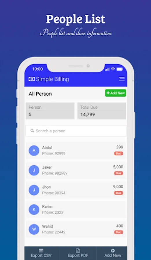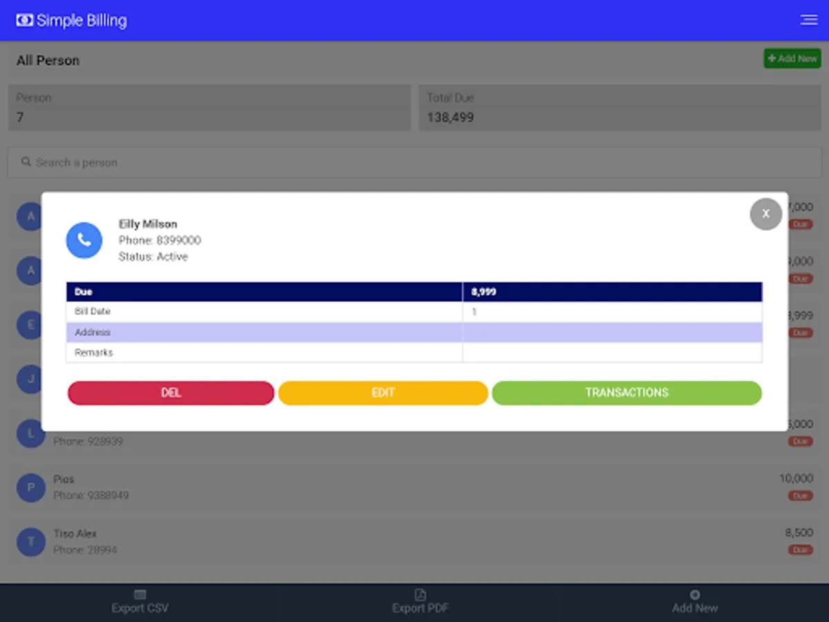 You can manage people & transaction data at any time. You can insert new data, edit and delete your data according to your need.
