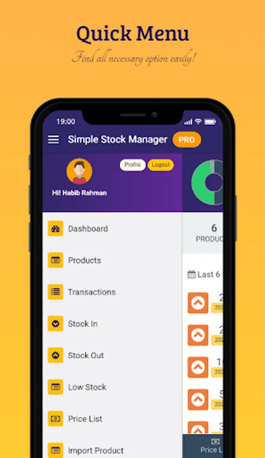 Our application offers you to manage your product stock & inventory in a simplistic way. Just list product, an entry in-out record of product transactions just it. It will provide all of the histories of the transaction report & more features.
