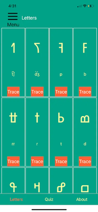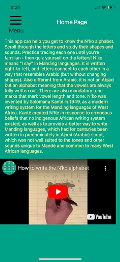 This app can help you get to know the N'ko alphabet. Scroll through the letters and study their shapes and sounds. Practice tracing each one until you're familiar-- then quiz yourself on the letters!