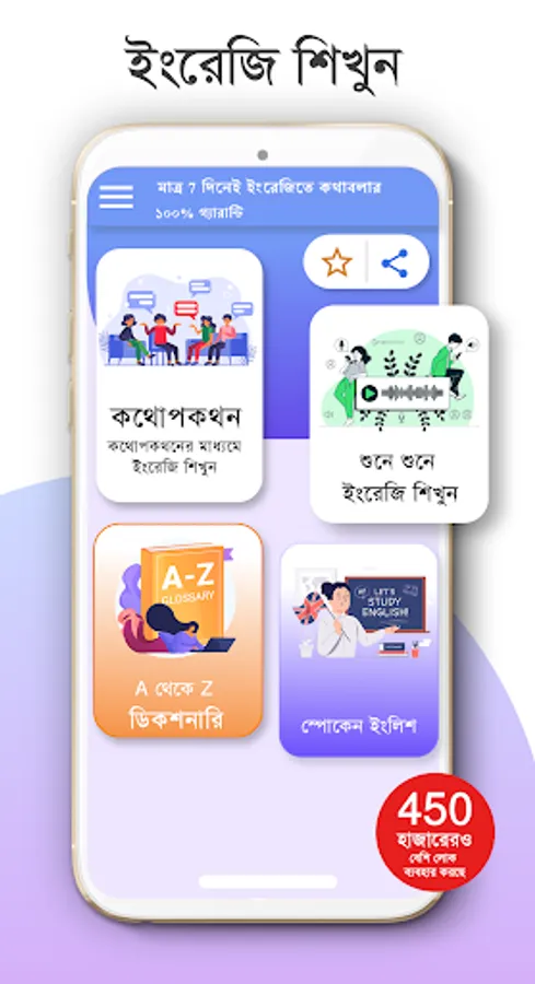 Learn spoken English and English grammar effectively, within 7 days. This English language learning and English to Bangla dictionary app offers 100% guarantee of helping you learn English word book and English grammar in only one week. Use the English learning app to become a pro at spoken English and make your transition from Bangali to English smoother than ever.