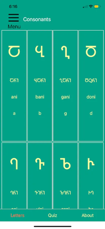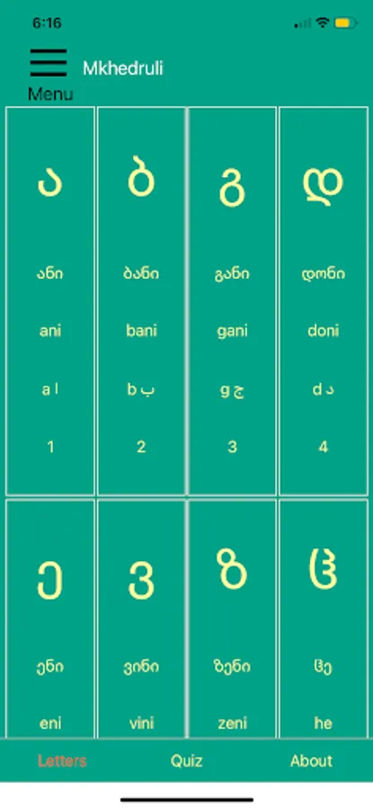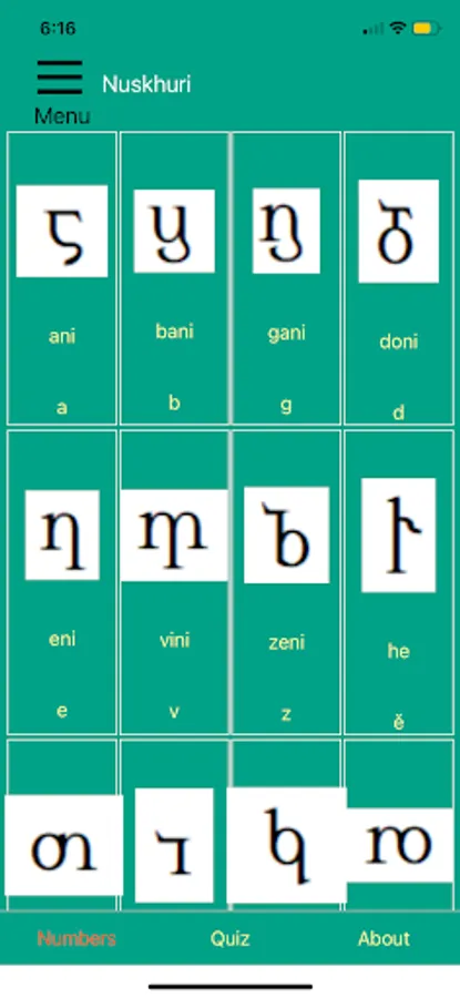 This app can help you get to know the Georgian alphabet Mkhedruli, as well as the two historical Georgian alphabets: Asomtavruli and Nuskhuri.
