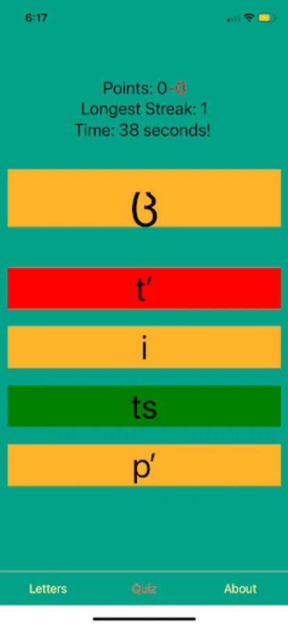 Scroll through the letters and study their shapes and sounds-- then quiz yourself on the letters.