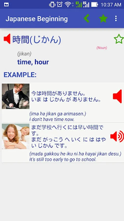 Each item in this series has an example sentence with both audio and image. The audio was recorded by two well-known Japanese voice talents: Yuko Kaida and Yukitoshi Tokumoto.