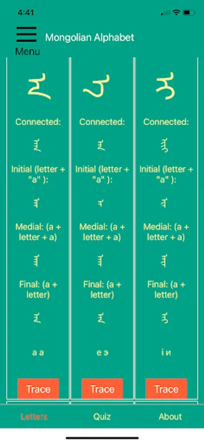 This app can help you get to know the Mongolian alphabet. Scroll through the letters and study their shapes and sounds. Practice tracing each one until you're familiar-- then quiz yourself on the letters!