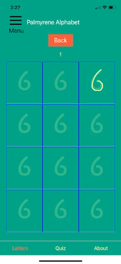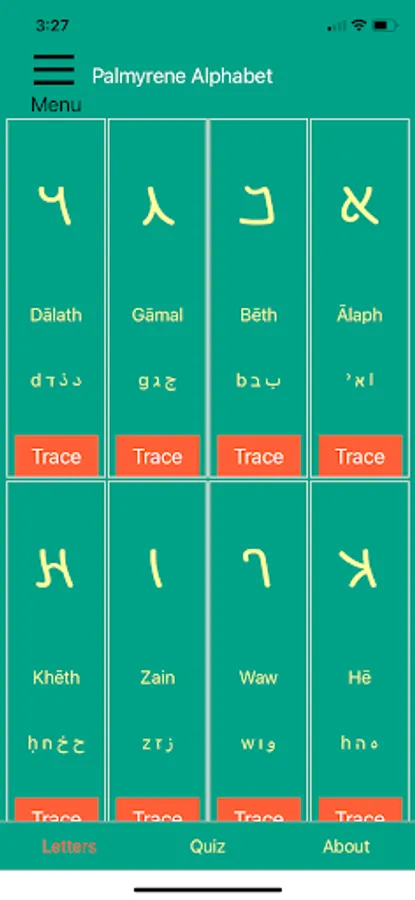 This app can help you get to know the Palmyrene alphabet. Scroll through the letters and study their shapes and sounds. Practice tracing each one until you're familiar-- then quiz yourself on the letters!