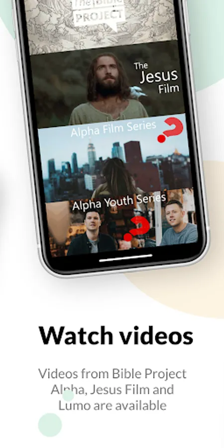 2. Videos on the Bible - 4 different video titles “Bible Project”, “Jesus Film”, “Alpha” and "Lumo Gospel Series" allows users to understand different books in the Bible better and grow in their relationship with God.