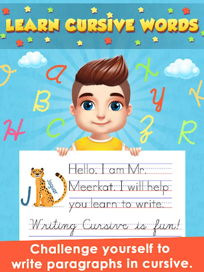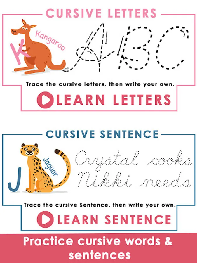 Kids Learn Cursive Writing with these digital Worksheets - cursive alphabet, cursive letters, cursive words, cursive sentences. Let your kids practice cursive penmanship with these handwriting worksheets app.